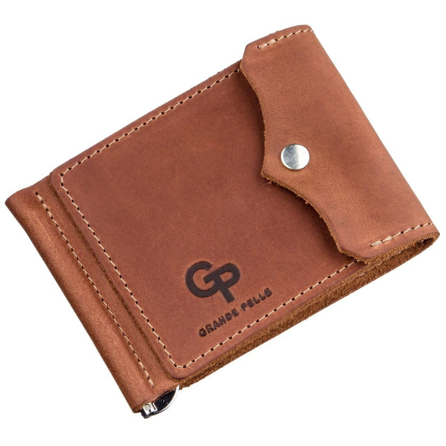 Рыжий компактный зажим из итальянской натуральной кожи высочайшего качества. На лицевой стороне аксессуара тисненный логотип бренда-производителя. Кожаные зажимы станут прекрасным аксессуаром для тех, кто любит минимализм и не любит кошельки. С таким зажимом ваши купюры будут в полном порядке. Аксессуар будет полезным подарком для близкого человека.