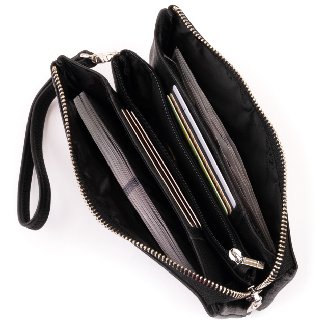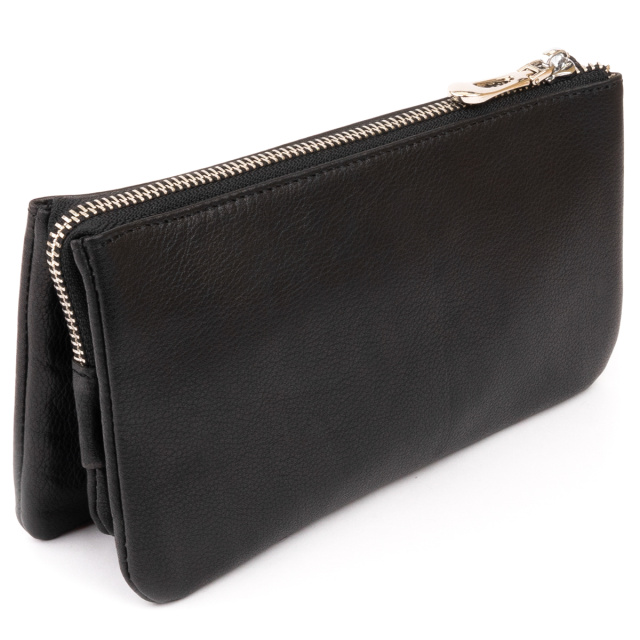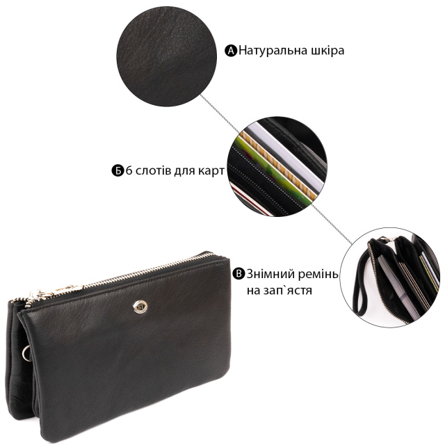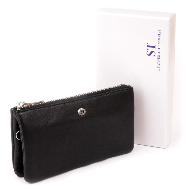 Черный универсальный клатч отличается своей вместительностью. В данную модель легко поместится ваш смартфон. Таким образом модель способна заменить вечернюю сумочку. Носить же клатч можно с помощью кожаного ремешка на запястье. Два вместительных кармана помогут удобно разложить вам деньги, также клатч имеет достаточно слотов для кредиток. Преимуществом черного цвета является то, что он не привязывает вас к определенной цветовой палитре в гардеробе. Он подходит под все.Сам клатч мягкий и приятный на ощупь. Внутри клатч сделан из натуральной кожи и плотного текстиля. В комплекте идет фирменная коробка с логотипом бренда. Кожаный клатч станет лучшим подарком для близкого человека.