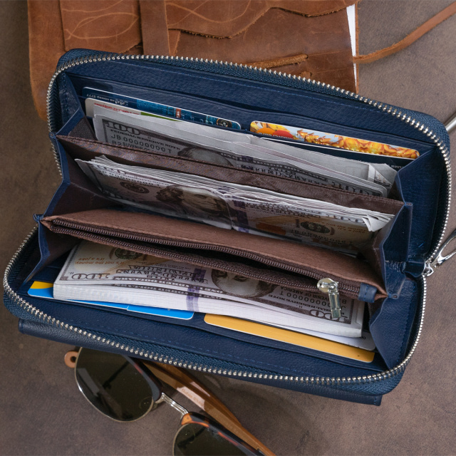 Самый удобный и самое главное вместительный женский кошелек. Выполнена модель в темно-синем приглушенном цвете из натуральной мягкой и эластичной кожи.В модели две автономных части (под купюры и вторая под кредитки). Кошелек вы можете носить как клатч с помощью ремешка на запястье. Его современный и продуманный дизайн не оставит вас равнодушной. С таким изделием вы можете быть уверены, что купюры не помнутся и будут в полном порядке. Стоит отметить, что в модели достаточно отделений, чтобы разложить все деньги карточки и даже вместить телефон. Внутри изделие изготовлено из натуральной кожи в сочетании с плотным текстилем. Кошелек упакован в фирменную картонную коробку белого цвета. Рекомендуем вам данную модель, если вы находитесь в поиске подарка для девушки.
