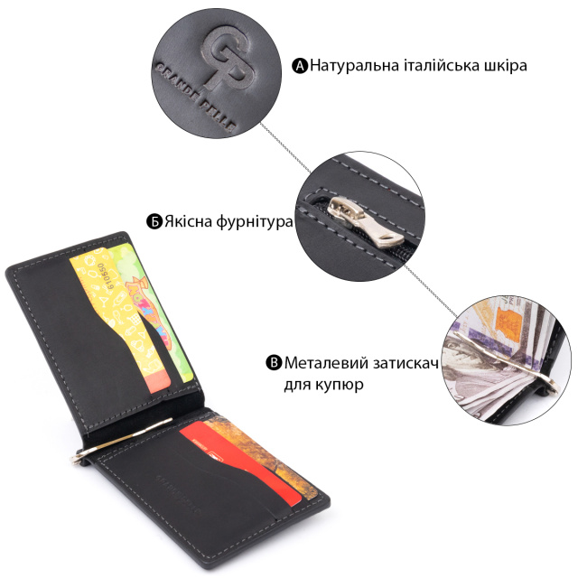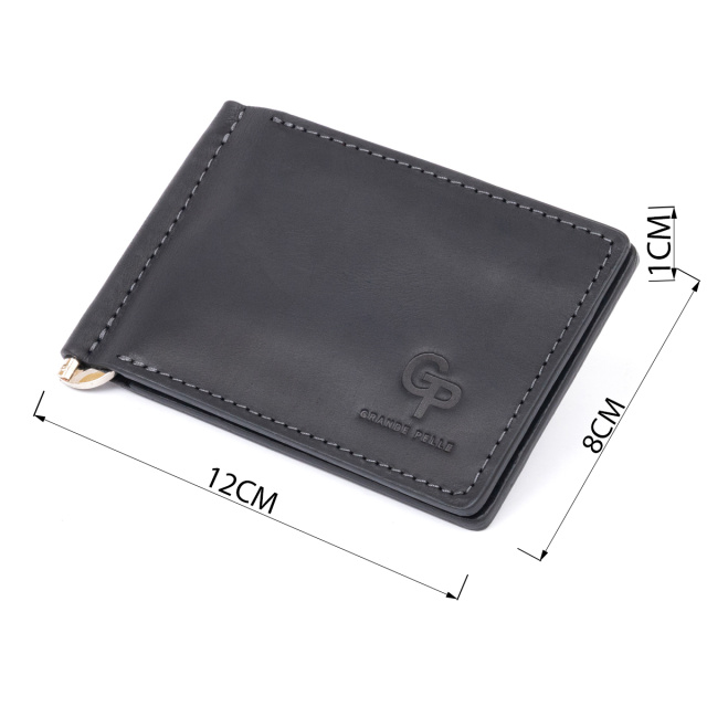 Кожаное портмоне минимального размера со всем необходимым функционалом. Портмоне дополнено зажимом для купюр из крепкого металла. Современный клиент старается подбирать максимально компактные аксессуары и носить с собой минимум вещей. Именно поэтому наше портмоне с зажимом станет идеальным вариантом для вашего повседневного аксессуара. Изделие без застежки. Портмоне имеет маленький кармашек для мелочи на тыльной стороне. В комплекте к зажиму идет войлочный чехол. Таким образом, аксессуар станет идеальным подарком для ваших близких.