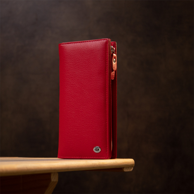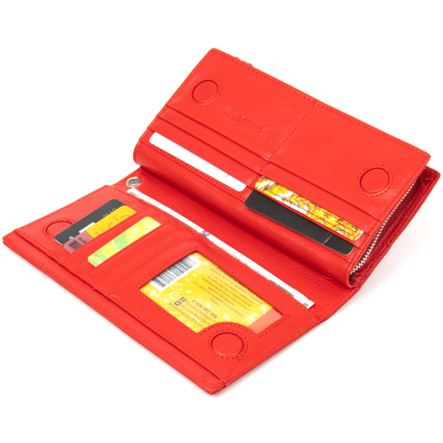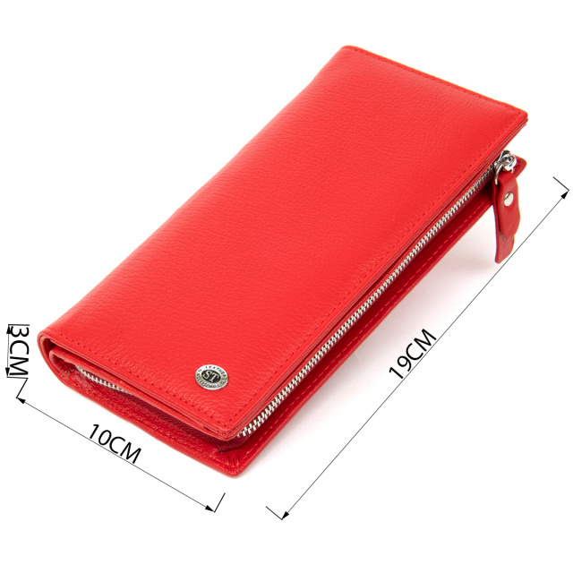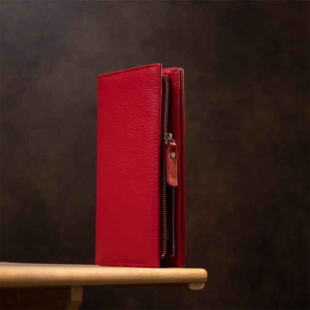 Материал: натуральная кожа. Цвет: красный. Размеры (ШхВхГ, см): 10х19х3 см. Страна производитель: Китай. Бренд: ST Leather. Описание: - основное отделение закрывается на молнию; - внутри расположено два больших отделения для купюр по всей длине; - монетница на молнии; - одно большое внешнее отделение на магнитах со слотами для карт и отделением на всю длину; - 11 карманов для карточек; - 1 прозрачный кармашек; - съёмный ремешок на запястье; Женский кожаный кошелек в классическом и практичном дизайне. Имеет красивый насыщенный красный цвет и зернистую матовую фактуру кожи. Внутри разместились удобные отделения для купюр, монет, слоты для карт и прочие карманы. Выполнено изделие очень качественно и надежно. Данный аксессуар станет отменным подарком для родного человека на любой праздник.