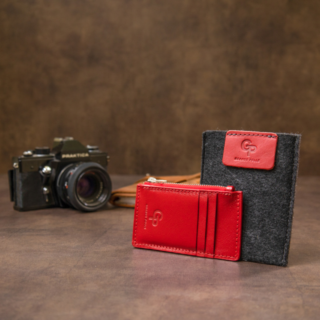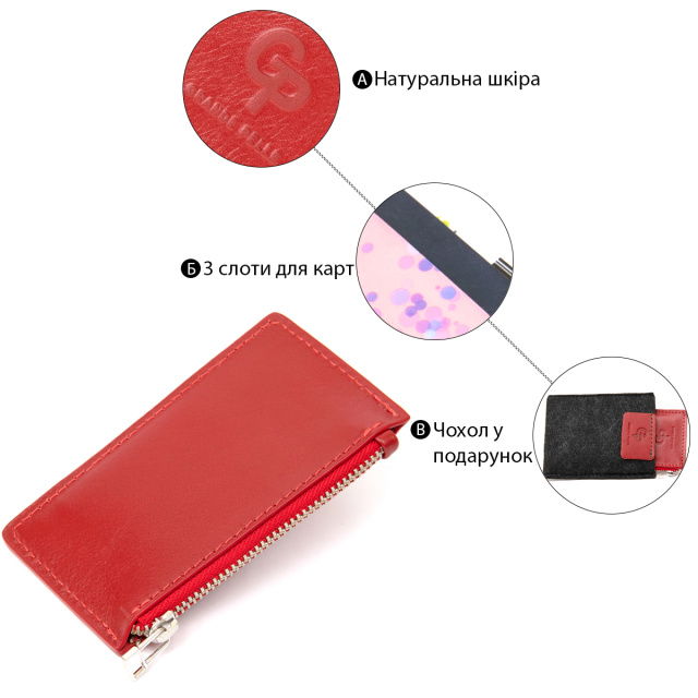 Компактный и практичных картхолдер для самых необходимых карт или визиток. Выполнен из натуральной мягкой кожи высокого качества украинским производителем. Имеется очень удобный карман на молнии, который можно использовать для хранения мелочи или прочих карт. Цвет – глубокий красный с серебреной фурнитурой.
