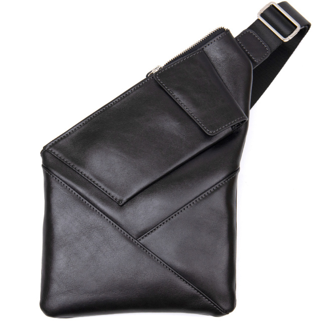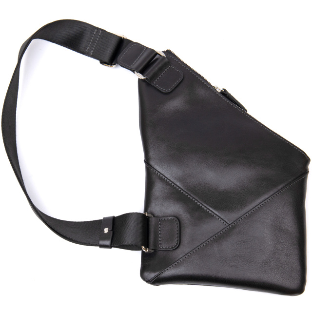 Интересная мужская сумка через плечо нестандартной формы, которая очень модная на сегодняшний день.  Выполнена из прочной и износостойкой натуральной кожи. Цвет черный, фактура гладкая и глянцевая. Ремень из прочного текстиля, его можно регулировать по длине. Упакована данная сумка в красивый фирменный чехол с ручками.