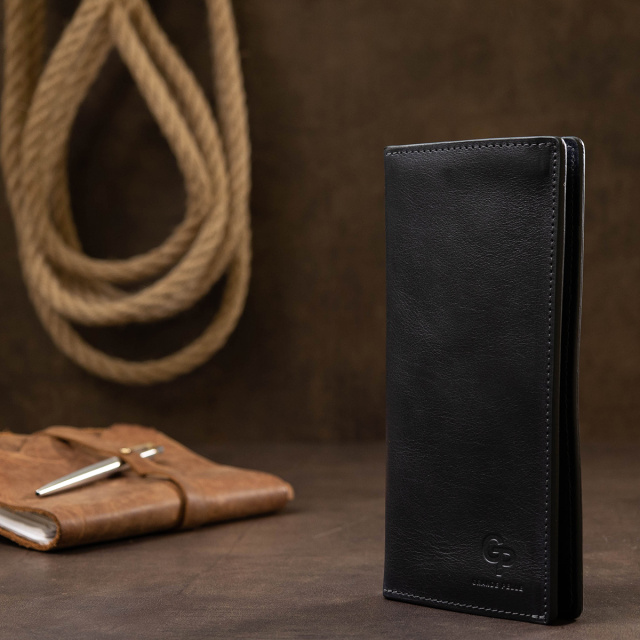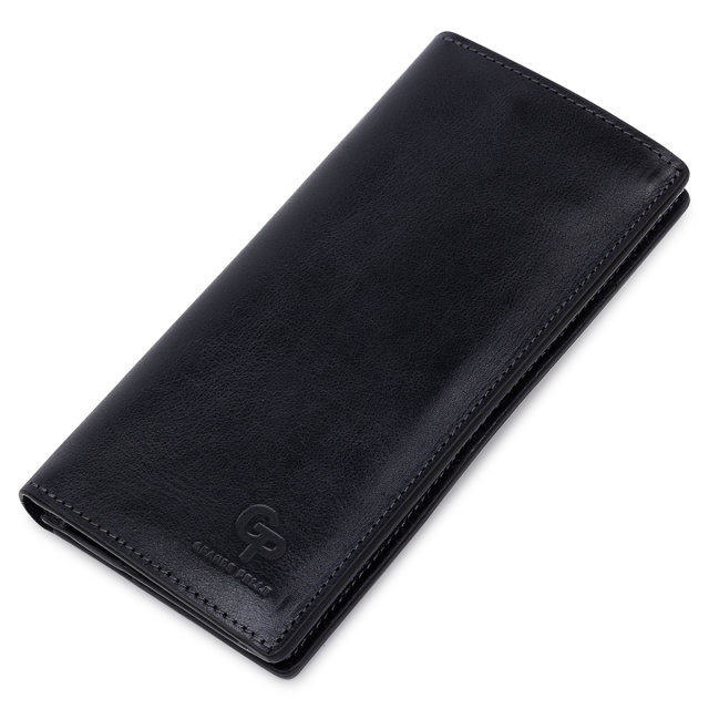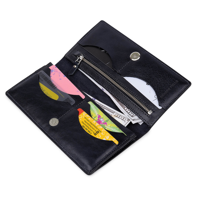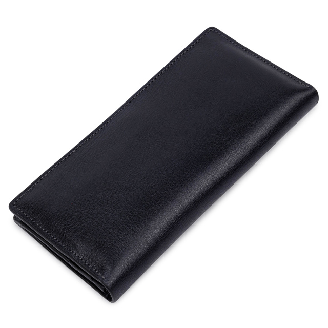 Отличный кошелек из высококлассной натуральной кожи в гладкой глянцевой фактуре. Имеет универсальный темно-синий цвет, поэтому подойдет под любой гардероб. Внутреннее наполнение представлено в виде вместительных отделений для банкнот, слотов для кредитных и визитных карт, а также монетницы на молнии. Упакован аксессуар в фирменную коробку.
