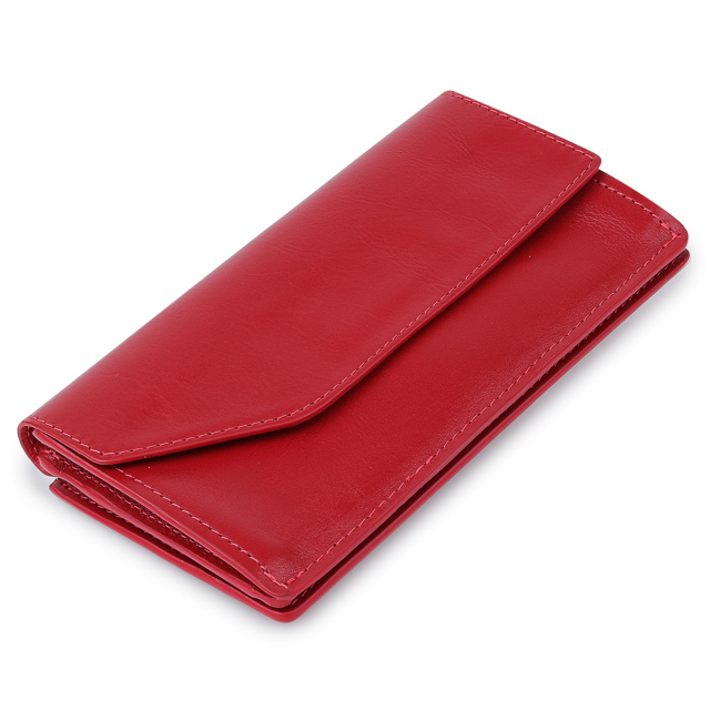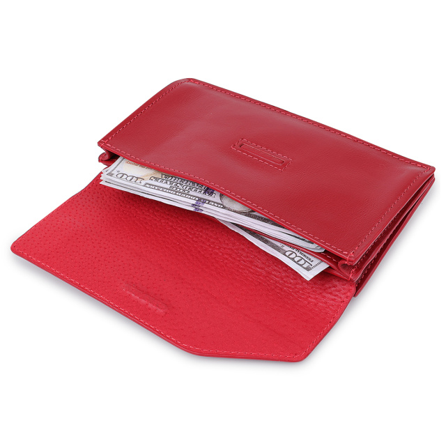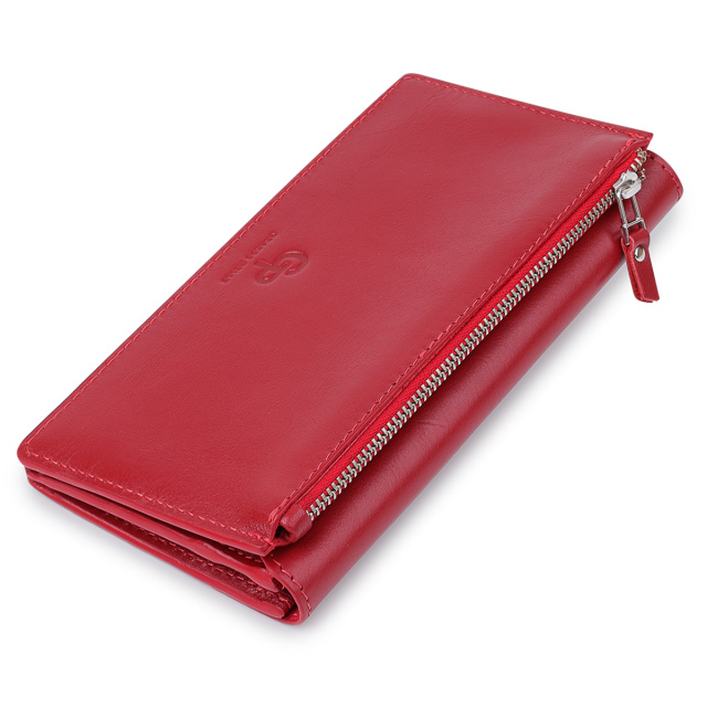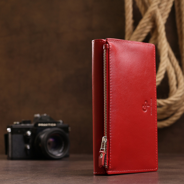 Стильное женское портмоне из высококлассной натуральной кожи в гладкой приятной на ощупь фактуре. Имеет красивый слегка приглушённый красный цвет, что смотрится просто шикарно. Внутри есть вместительные отделения для купюр, слоты для пластиковых карт и визиток, а также внешняя монетница на молнии. Закрывается портмоне оригинальным скошенным клапаном на магните.
