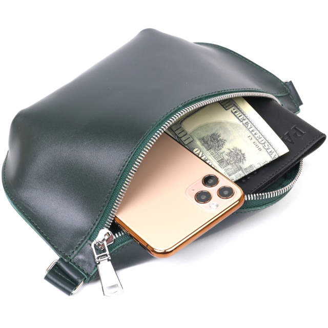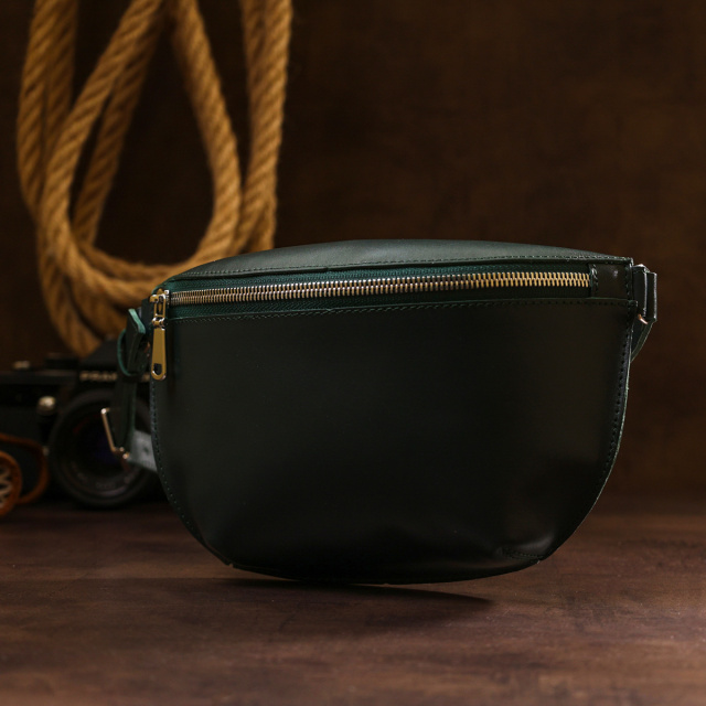 Стильная женская сумка на пояс в трендовом темно-зеленом цвете от украинского производителя. Материал – натуральная кожа высокого качества с отменными характеристиками эксплуатации. Внутри расположено вместительное отделение на молнии. Ремень выполнен также из натуральной кожи и может регулироваться по длине.