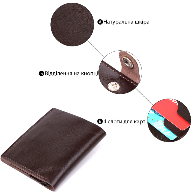 Строгое мужское портмоне в насыщенном коричневом цвете от украинского производителя. Материал – натуральна кожа высокого качества и повышенной износоустойчивости. Внутри расположено просторное основное отделение для купюр и слоты для пластиковых карточек. Фактура аксессуара – гладкая и очень приятна на ощупь.