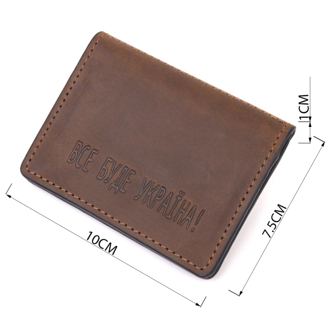 Патриотичная кожаная обложка на авто документы, с тиснением “Все буде Україна” на лицевой стороне. Изделия из кожи всегда считались отличным подарком, не зависимо от пола и возраста. Аксессуар пошито с итальянской качественной кожи. По краям модель прошита коричневой строчкой в дизайн изделия. Изделие небольшого размера и с легкостью поместится в карман или маленькую сумку. В комплекте к изделию идет фирменный фетровый чехол.