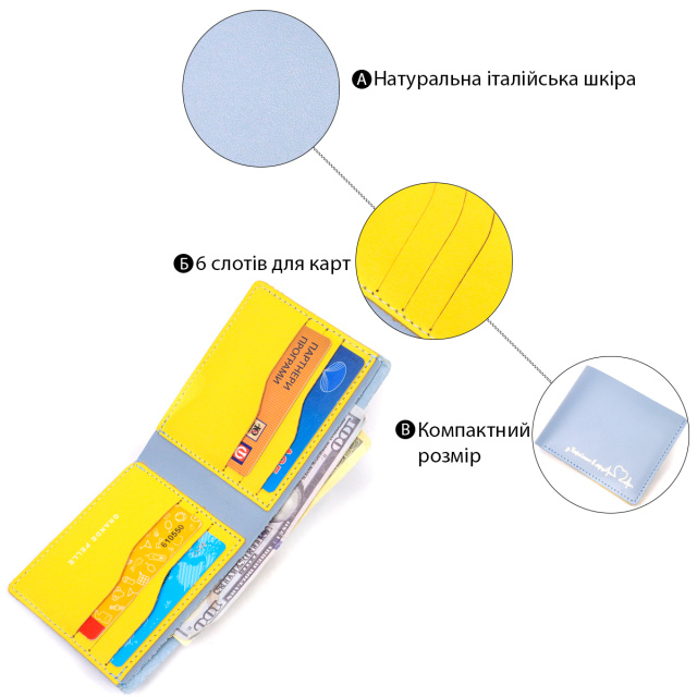 Стильный кожанный кошелек , в комбинации двух цветов голубого снаружи и желтого внутри c патриотической надписью “З Україною в сердці”. Изделие пошито из качественной кожи, с високими показателями износостойкости . Портмоне имеет одно большое отделение для купюр всех номиналов, а также достаточное количество отделений для карт, без застежки. Кожаный кошелек станет отличным подарком на все случаи жизни.