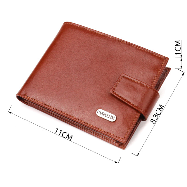 Небольшое мужское портмоне, из натуральной гладкой кожи. Аксессуар имеет одно основное отделение с перегородкой, в которое помещаются купюры всех номиналов, двенадцать карманов для карточек, четыре из которых под сеточкой. Закрывается аксессуар хлястиком на кнопку. Цвет фурнитуры – серебро. Вы легко сможете поместить его в карман брюк или маленькую сумку. Упакован бумажник картонную коробку. Кожаный кошелек является отменным подарком для родных и близких людей.