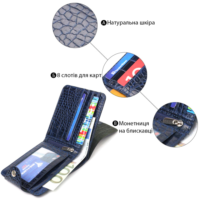 Ультрамодный мужской кошелек из натуральной фактурной кожи с тиснением под крокодила. Аксессуар имеет одно отделение для купюр, в которое помещаются купюры всех номиналов, четыре прилегающих кармана, карман на молнии, на всю длину кошелька, а также восемь отсеков для карточек, один из них под сеточкой. Закрывается модель хлястиком на кнопку. В современном мире кожаное портмоне является просто необходимой вещью, а качественное кожаное портмоне является еще и неплохим вложением денег, так как прослужит не один год.