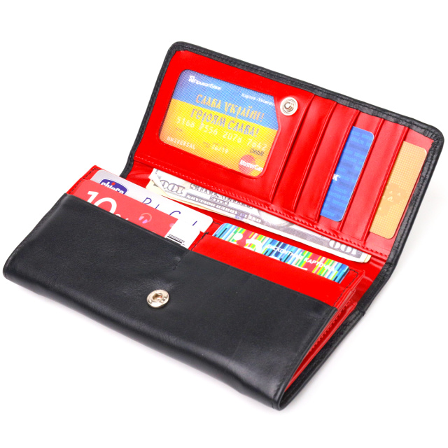 Оригинальный женский кошелек, из натуральной гладкой кожи, черный снаружи и красный - внутри. Аксессуар имеет три основных отделения, в которые помещаются купюры всех номиналов, две перегородки, одна из них на молнии, одиннадцать карманов для карточек, один из которых под сеточкой, монетница на молнии - снаружи и один прилегающий карман. Закрывается аксессуар клапаном на кнопку. Отличный аксессуар, надежного производителя, который прослужит очень долго.