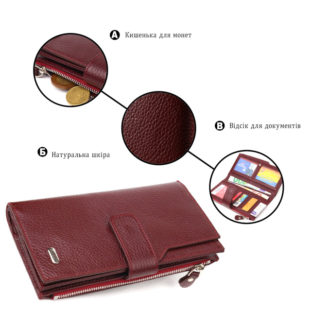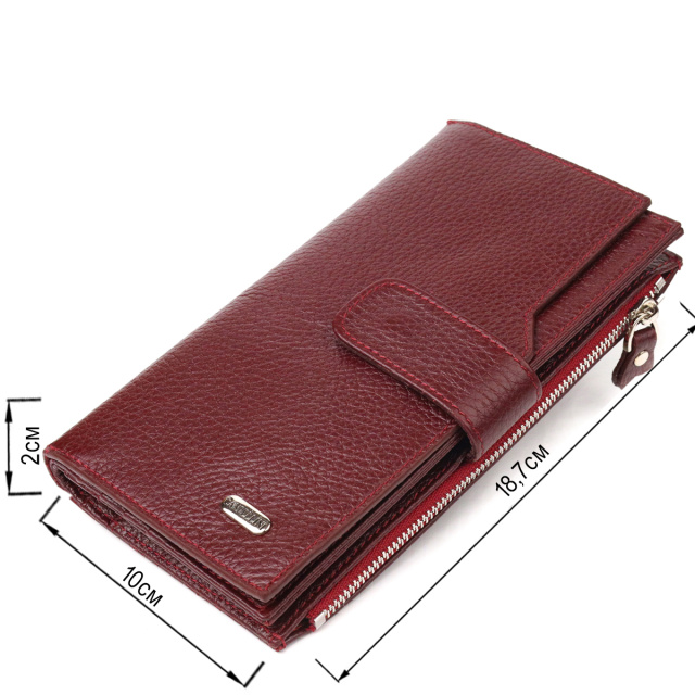 Надежный женский кошелек, из натуральной кожи. Аксессуар имеет шесть прилегающих карманов, в которые поместятся купюры всех номиналов, вместительную монетницу и двадцать карманов для карточек. Закрывается аксессуар хлястиком на кнопку. Если Вы хотите порадовать и себя и удивить близких, то непеременно покупайте кожаные аксессуары в нашем магазине, качество и цена Вас однозначно порадует.