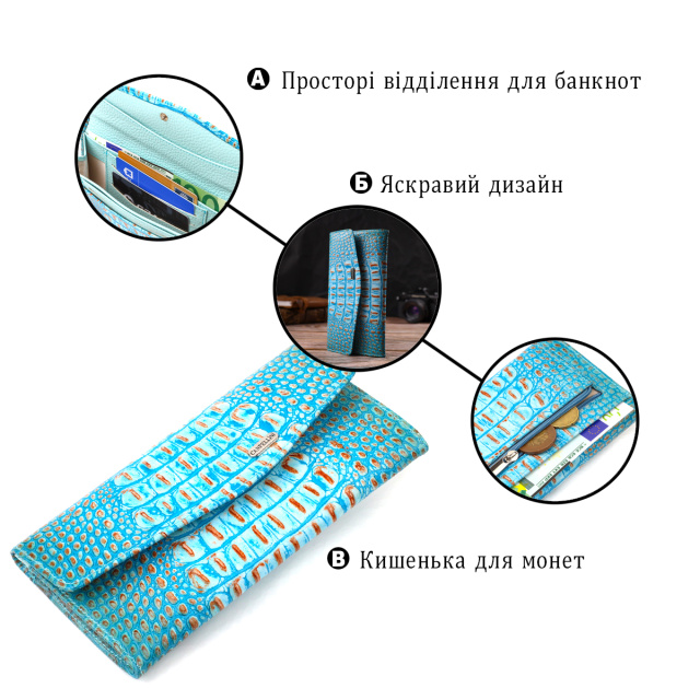 Необычного цвета кошелек горизонтального типа из качественной натуральной кожи, с тиснением под крокодила. Аксессуар имеет одно основное отделение, шесть карманов для карточек, четыре прилегающих кармана и монетницу. Закрывается аксессуар пополам клапаном на кнопку. Приобретая кожаный аксессуар этой фирмы, себе или на подарок, будьте уверены, что он прослужит Вам не один год.