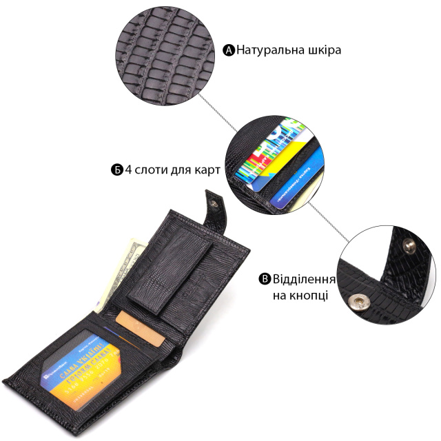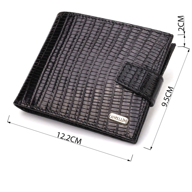 Стильный мужской кошелек среднего размера из натуральной кожи с тиснением. Аксессуар имеет основное отделение для купюр с перегородкой, четыре ячейки для карточек, два кармана под сеточкой, три прилегающих кармана и монетницу. Кошелек складывается пополам, закрывается хлястиком на кнопку. На лицевой стороне в правом нижнем углу, расположен металлический логотип компании производителя. Покупая кожаный кошелек в нашем магазине, Вы получаете модный, стильный аксессуар, который прослужит не один год.