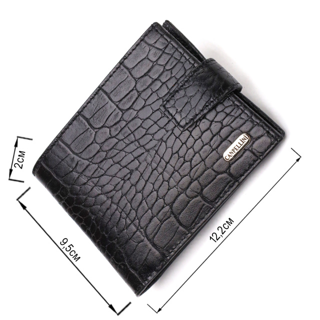 Фактурный мужской кошелек среднего размера из натуральной кожи с тиснениемпод крокодила. Аксессуар имеет основное отделение для купюр с перегородкой, четыре ячейки для карточек, два кармана под сеточкой, три прилегающих кармана и монетницу. Кошелек складывается пополам, закрывается хлястиком на кнопку. На лицевой стороне в правом нижнем углу, расположен металлический логотип компании производителя. Покупая кожаный кошелек в нашем магазине, Вы получаете модный, стильный аксессуар, который прослужит не один год.