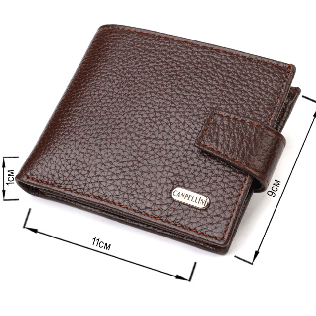 Мужское портмоне небольшого размера из натуральной зернистой кожи. Аксессуар имеет основное отделение для купюр с перегородкой, три ячейки для карточек, два карманы под сеточкой, два прилегающих кармана и монетницу. Кошелек складывается пополам, закрывается хлястиком на кнопку. На лицевой стороне в правом нижнем углу, расположен металлический логотип компании производителя. Многофункциональный мужской бумажник из очень прочной кожи отличный выбор подарка для солидного мужчины.
