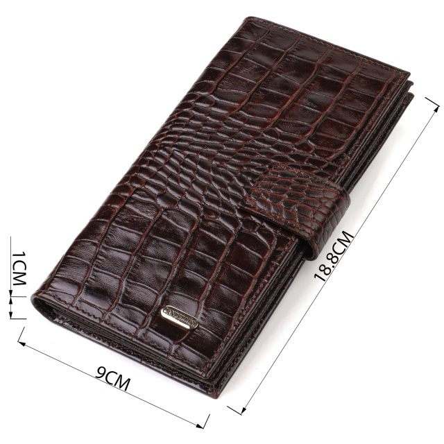 Удобный мужской кошелек из натуральной фактурной кожи с тиснением под крокодила. Аксессуар имеет одно основное отделение для купюр всех номиналов, одиннадцать ячеек для карточек, карман под сеточкой для пропуска и два скрытых кармана. Закрывается аксессуар пополам хлястиком на кнопку. На лицевой стороне, в правом нижнем углу металлический логотип компании производителя. Приобретая кожаный аксессуар этой фирмы, себе или на подарок, будьте уверены, что он прослужит Вам не один год.