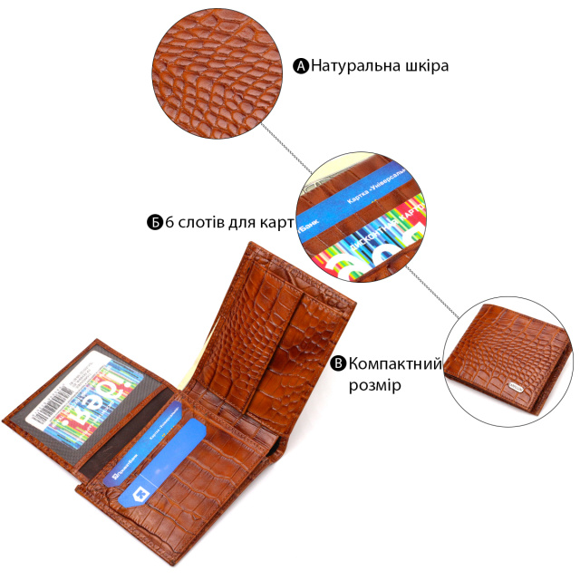 Ультрамодный мужской кошелек из натуральной кожи с тиснением под крокодила. Аксессуар имеет одно отделение для купюр всех номиналов, шесть ячеек для карточек, три кармана под сеточкой для документов и монетницу. Закрывается аксессуар пополам без застежки. На лицевой стороне, в правом нижнем углу металлический логотип компании производителя. Приобретая кожаный аксессуар этой фирмы, себе или на подарок, будьте уверены, что он прослужит Вам не один год.