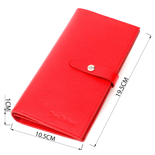 Стильный клатч из натуральной кожи, для современных женщин. Аксессуар состоит из вместительного отделения для купюр, десяти ячеек для пластиковых карт, кармашка на молнии, двух прилегающих карманов и монетницы. В изделии использована качественная фурнитура. Закрывается клатч хлястиком на кнопку, для удобства есть две кнопки, которые позволяют увеличить объем аксессуара.
