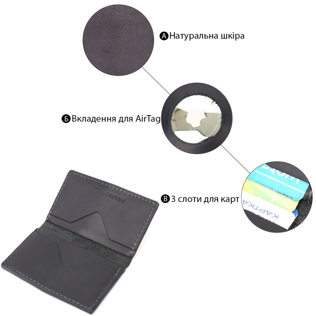 Удобный кожаный картхолдер ручной работы из натуральной высококлассной винтажной кожи. На лицевой стороне изделие имеет тисненый логотип производителя Grande Pelle. Аксессуар состоит из трех отделений под карточки. Кроме удобного функционала фишкой этого картхолдера является держатель для смарт трекера Apple AirTag, это современное устройство определяющее местонахождение вещи к которой он прикреплен. Благодаря компактным размерам аксессуара он отлично помещается в кошелек, карман или сумку любого размера, что поможет пользователям легко найти потерянные или забытые вещи. Отличный аксессуар для современного человека. Внимание, смарт трекер Apple AirTag не идет в комплект с аксессуаром!