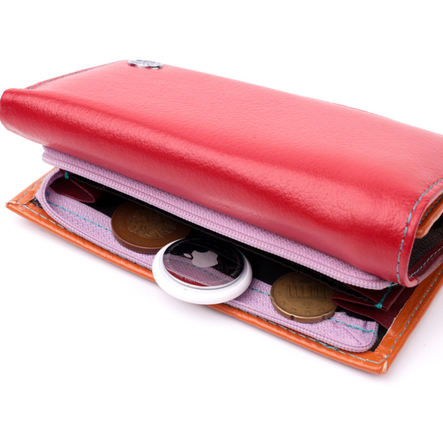 Стильное женское портмоне в три сложения удобного среднего размера из натуральной кожи высочайшего качества. Первое, что бросается в глаза это цветовое решение, вместо однотонного аксессуара мы имеем разноцветный, который содержит два основных наружных цвета - красный и оранжевый и несколько дополнительных внутри. Кожаное портмоне очень практичное и служит достаточно долго. Аксессуар состоит из двух вместительных карманов для купюр, кармана на молнии через всю длину, пяти ячеек для карт, прозрачного окошка для пропуска и наружного кармана на молнии с перегородкой, что отлично прослужит для монет. Портмоне дополнено надежной фурнитурой. Укомплектован кошелек в фирменную картонную коробку белого цвета. Изделие станет идеальным подарком для девушки любого возраста.