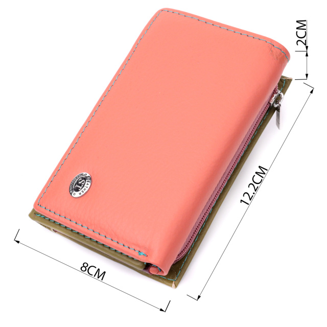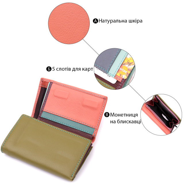 Идеальное женское портмоне в три сложения из натуральной кожи высочайшего качества. Первое, что бросается в глаза это цветовое решение, вместо однотонного аксессуара мы имеем разноцветный, который содержит два основных наружных цвета и несколько дополнительных внутри. Кожаное портмоне очень практичное и служит достаточно долго. Аксессуар состоит из двух вместительных карманов для купюр, кармана на молнии через всю длину, пяти ячеек для карт, прозрачного окошка для пропуска и наружного кармана на молнии с перегородкой, что отлично прослужит для монет. Портмоне дополнено надежной фурнитурой. Укомплектован кошелек в фирменную картонную коробку белого цвета.