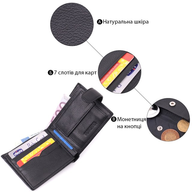 - 1 карман для монет, что закрывается клапаном на кнопку;