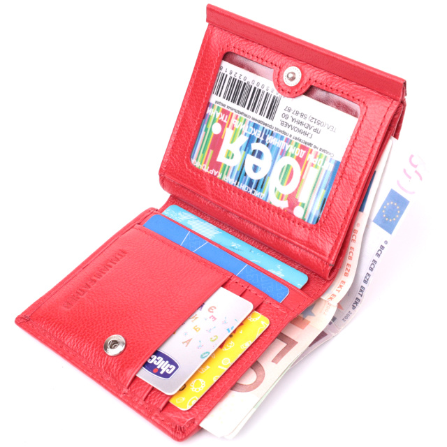 Стильная и популярная модель кошелька из качественной натуральной кожи, в ярком красном цвете. Аксессуар состоит из двух отделений для купюр, кармана на молнии, трех ячеек для пластиковых карт, двух скрытых карманов, одного кармана под пленкой и монетницы, снаружи. Модель имеет качественную фурнитуру и закрывается пополам на кнопку. С таким кошельком Вы проходите далеко не один год. Модель упакована в коробочку, что очень удобно если изделие предназначено для подарка.