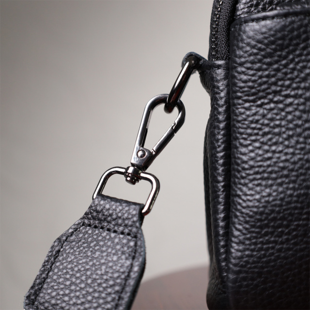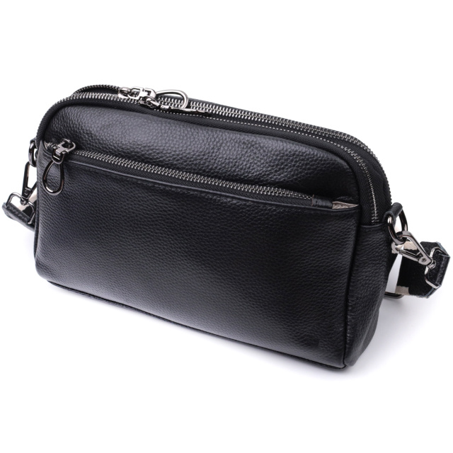 Удобная женская сумка на все случаи из натуральной кожи флотар, которая имеет зернистую фактуру. В изделии использована кожа черного цвета. Аксессуар состоит из двух отделений, которые закрываются на молнии, потайного кармана на молнии и кармана открытого типа, а также двух карманов снаружи на лицевой и тыльной стороне. Носить сумку можно в руке, под рукой, на плече и через плечо, для этого имеется текстильный съемный ремень. В аксессуаре использована качественная фурнитура цвета темного серебра. Отличный вариант для подарка близким и дорогим девушкам и женщинам.