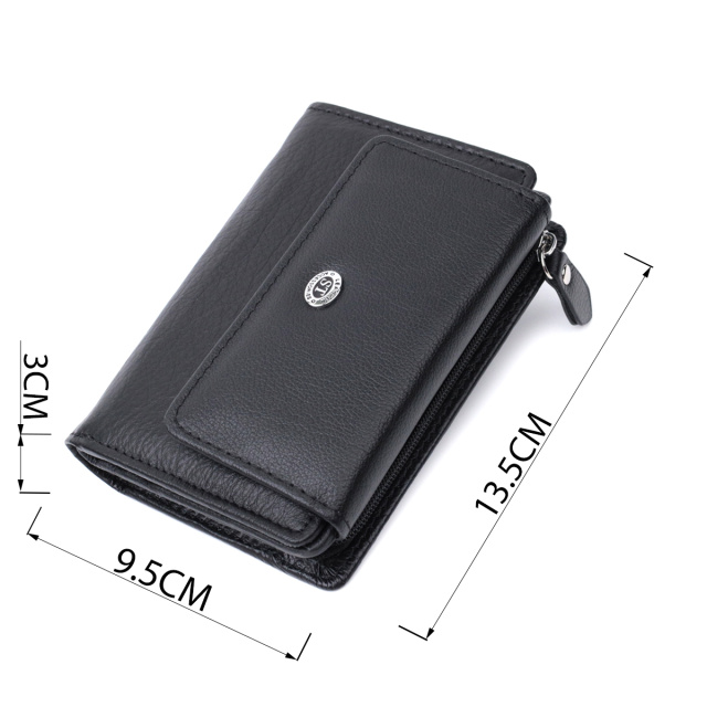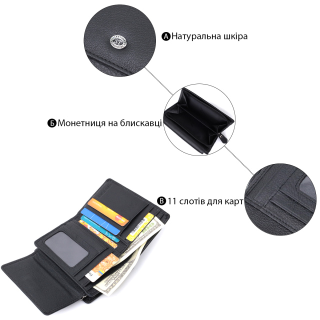 Кошелек среднего размера для женщин из натуральной качественной кожи. Модель имеет удобный размер и закрывается на магнит. Снаружи можно увидеть отделение для монет. Аксессуар внутри оснащен двумя отделениями для купюр и одиннадцатью ячейками для карт. Упакован аксессуар в белую плотную картонную коробку с фирменным логотипом.