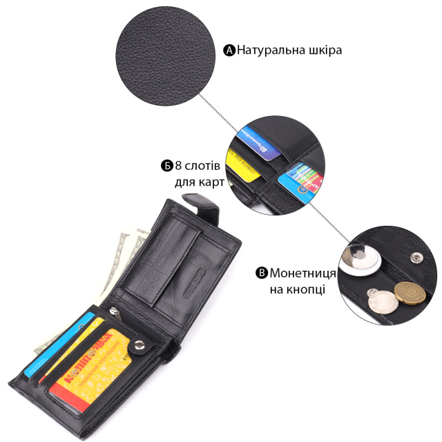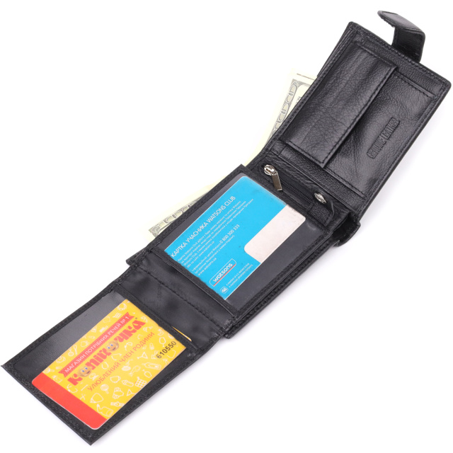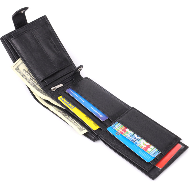 Вместительный кошелек для мужчин которые ценят качество и практичность. Аксессуар из натуральной добротной кожи, он состоит из двух вместительных отделений для купюр, двух скрытых карманов ,трех карманов под пленкой, восьми ячеек для пластиковых карт, кармана на молнии и кармана для монет В нижнем правом углу находится аккуратный металлический логотип бренда, подтверждающий оригинальность и качество изделия.