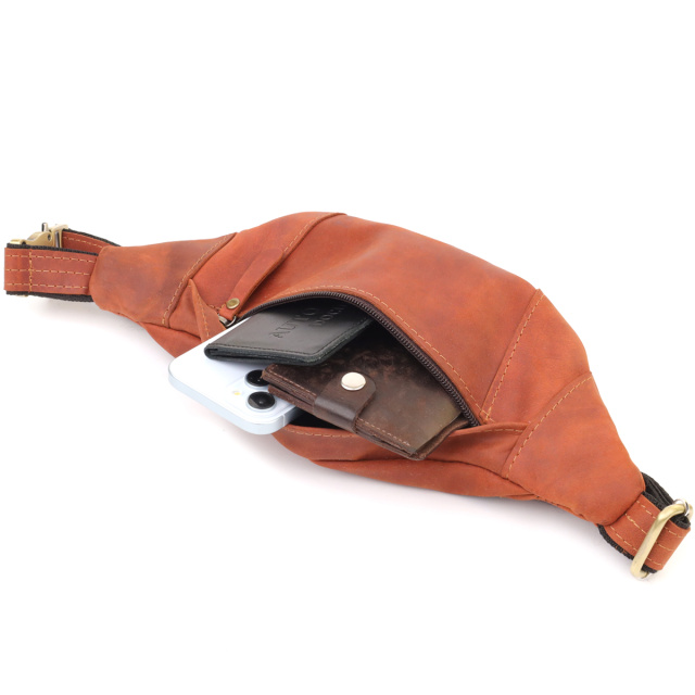 Аксессуар выполнен из прочной натуральной винтажной кожи с благородной текстурой и дополнен качественной металлической фурнитурой. Внутри — одно основное отделение на молнии, надёжно защищающее содержимое. Регулируемый текстильно-кожаный ремень позволяет подстроить посадку под себя — носите как на поясе, так и через плечо.