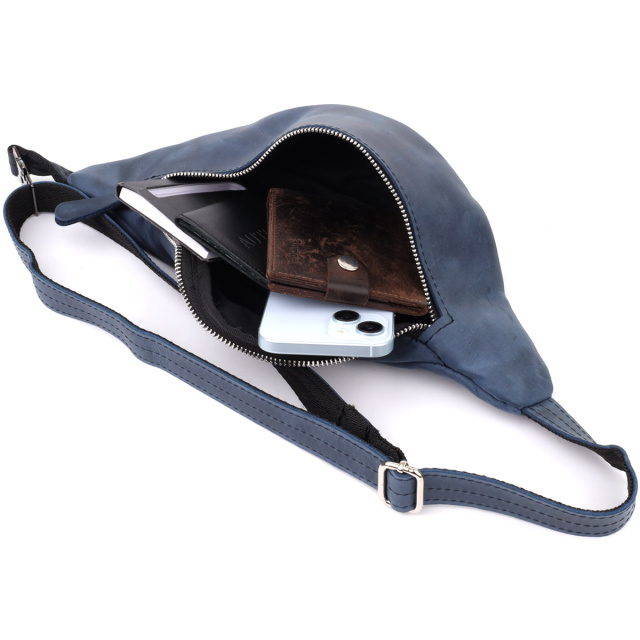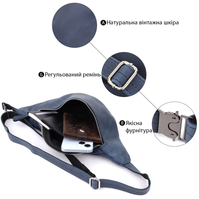 Сумка-бананка из натуральной кожи Shvigel в синем цвете — современный акцент и украинское качество. Мужская сумка-бананка от украинского бренда Shvigel в глубоком синем цвете — это удачное сочетание практичности, современного стиля и оригинальности. Модель выполнена из прочной натуральной винтажной кожи, которая не только выглядит благородно, но и прекрасно носится.