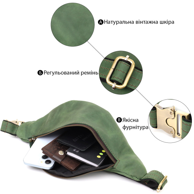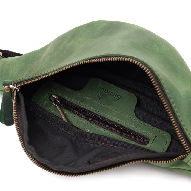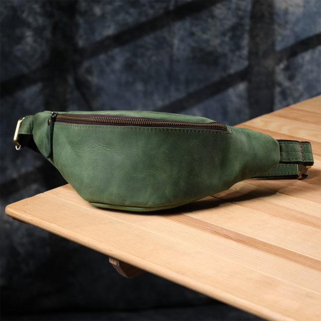 Мужская сумка-бананка от украинского бренда Shvigel — удачное сочетание практичности, стиля и индивидуальности. Выполненная из прочной натуральной винтажной кожи, она представлена в глубоком зелёном цвете, который выгодно выделяется среди привычных чёрных и коричневых моделей. Такой оттенок придаёт аксессуару свежесть и благородство, подчёркивая вашу оригинальность и уверенность в себе.