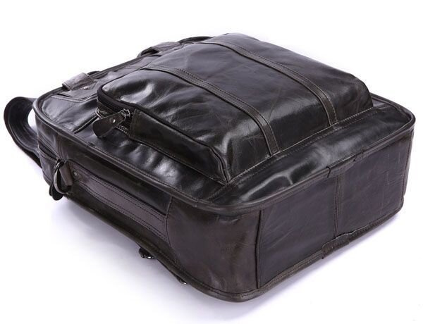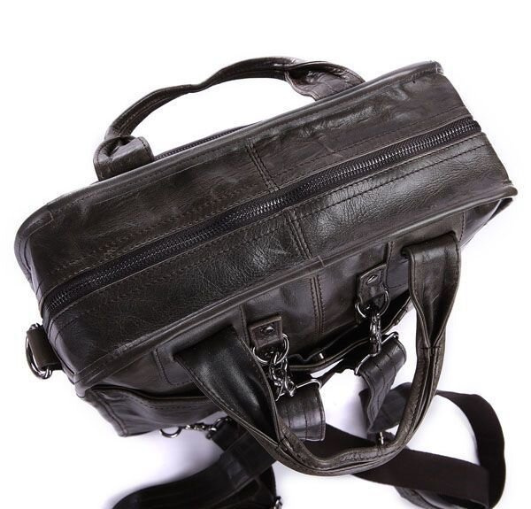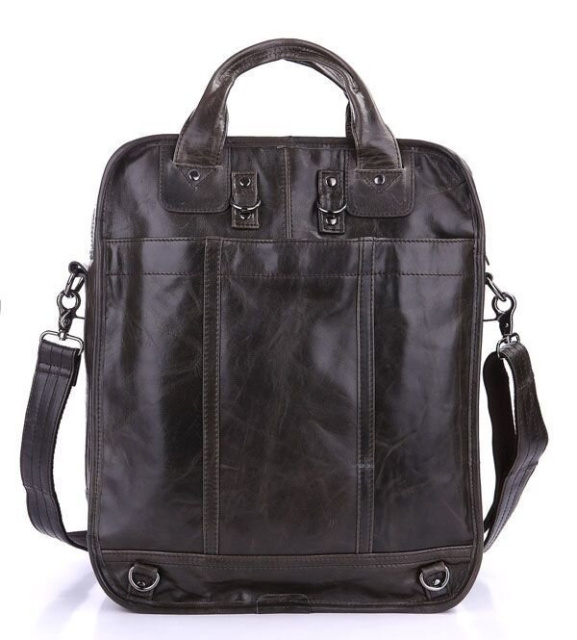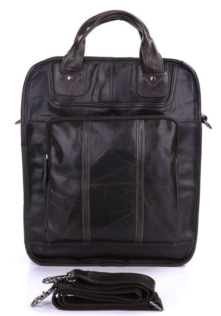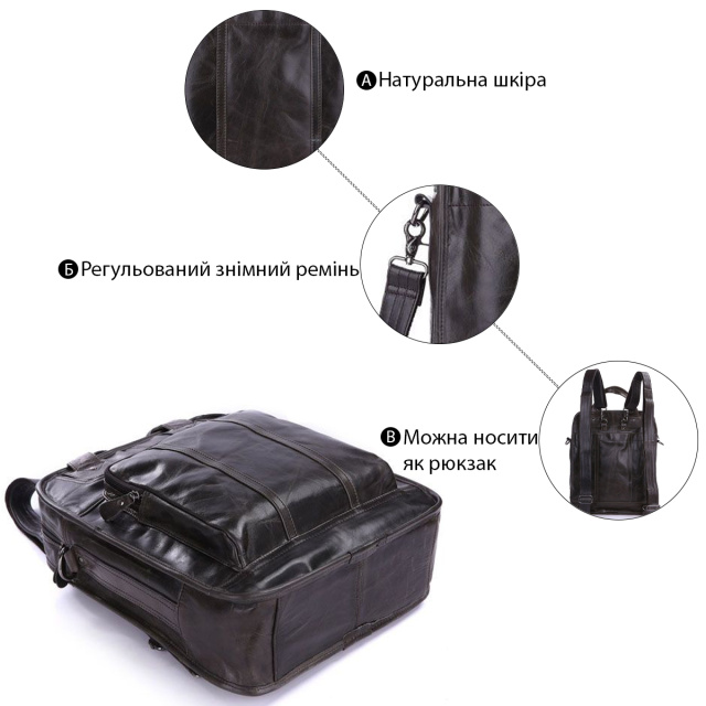 Вертикальная кожаная сумка трансформер из натуральной кожи темно-серого цвета. Сумку можно носить в руке, через плечо и за спиной как рюкзак. На лицевой стороне сумка имеет большое отделение кармана на молнии, за которым прячется большой потайной карман на магнитной кнопке. На задней стороне сумка имеет огромный накладной карман на магнитной кнопке. Внутренний отсек сумки закрывается на молнию. Внутри есть карман на молнии и два накладных кармана для телефонов.