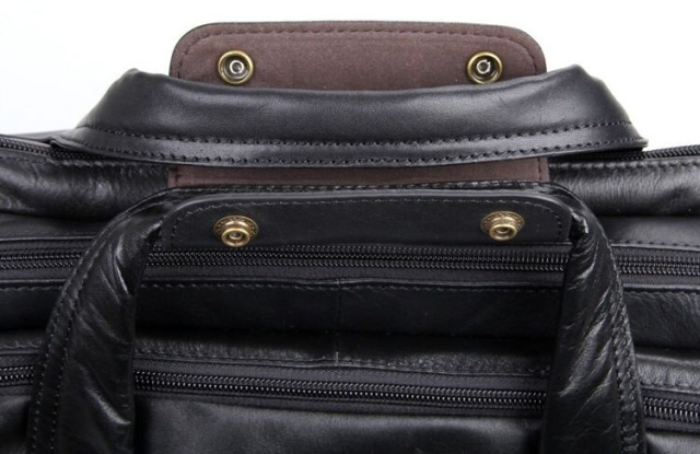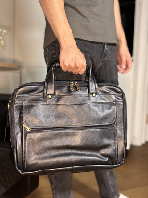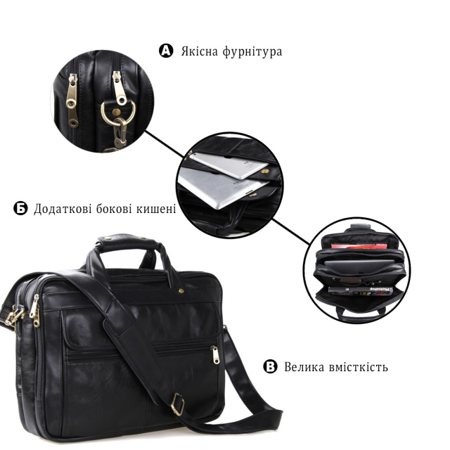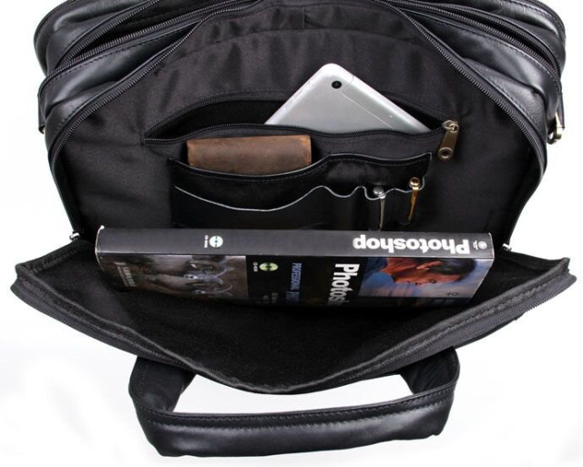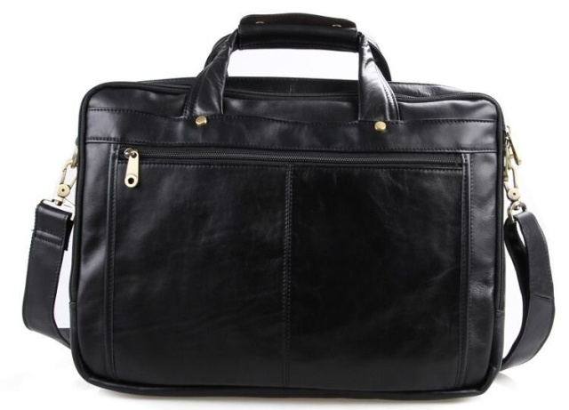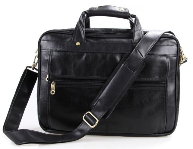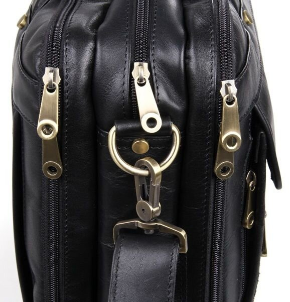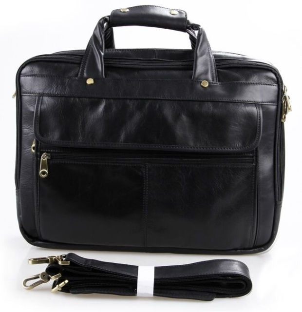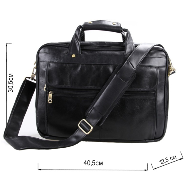 Вместительная мужская многофункциональная сумка для ноутбука. Аксессуар выполнен из гладкой натуральной кожи приятной на ощупь. Цвет фурнитуры: латунь. На лицевой стороне изделия расположен накладной карман под клапаном и небольшое отделение на молнии. На задней внешней стороне находится карман на молнии. Подкладка выполнена из прочного текстильного черного цвета. Сумку можно переносить в руке (ручки кожаные) или через плечо (в комплекте съемный, регулируемый плечевой ремень).