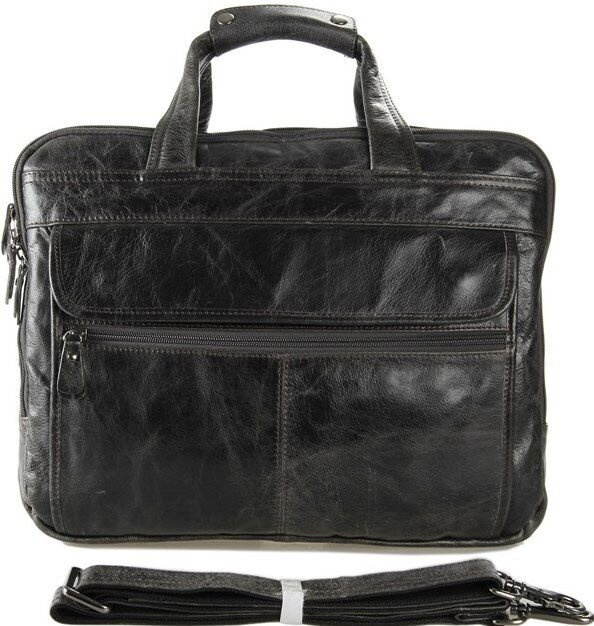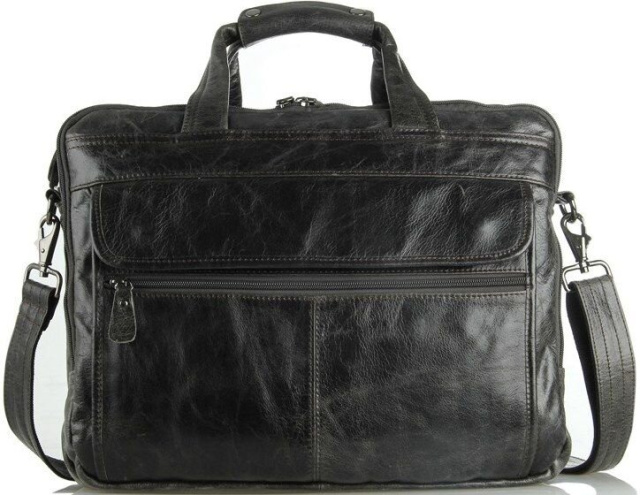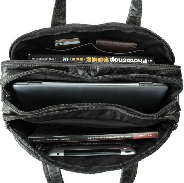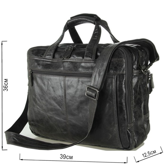Сумку можно носить в руке при помощи кожаных ручек, а также через плечо, в комплекте съемный плечевой ремень из сочетания прочного текстиля и кожи. Аксессуар прошит прочной нитью, что придает изделию прочности и оригинального вида. Аксессуар закрывается на молнию. На лицевой стороне, под клапаном на магнитах, расположено два кармана, один из них на молнии. На задней внешней стороне находится отделение на молнии. Подкладка выполнена из прочного текстильного материала черного цвета. Такой кожаный аксессуар станет превосходным подарком любимому мужу, сыну, отцу или руководителю.