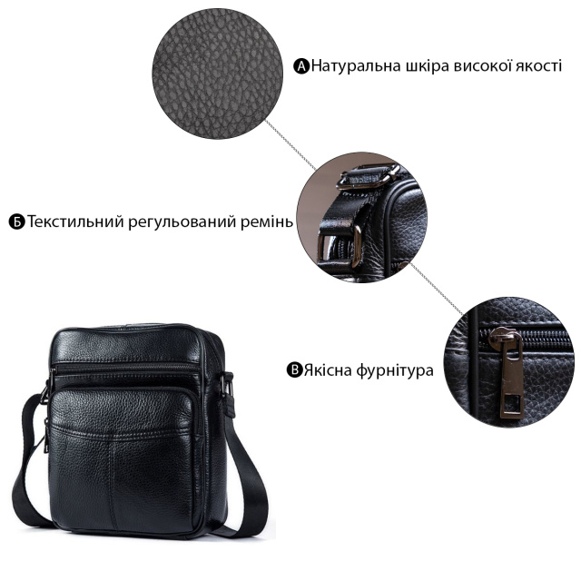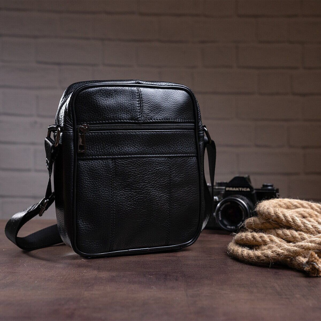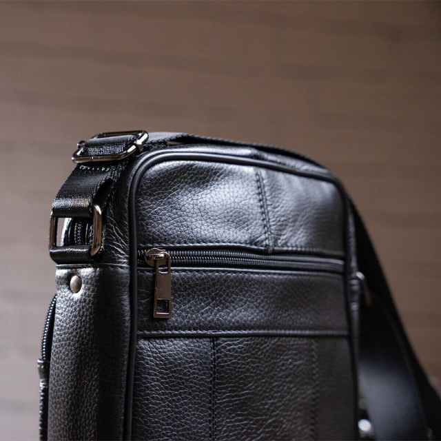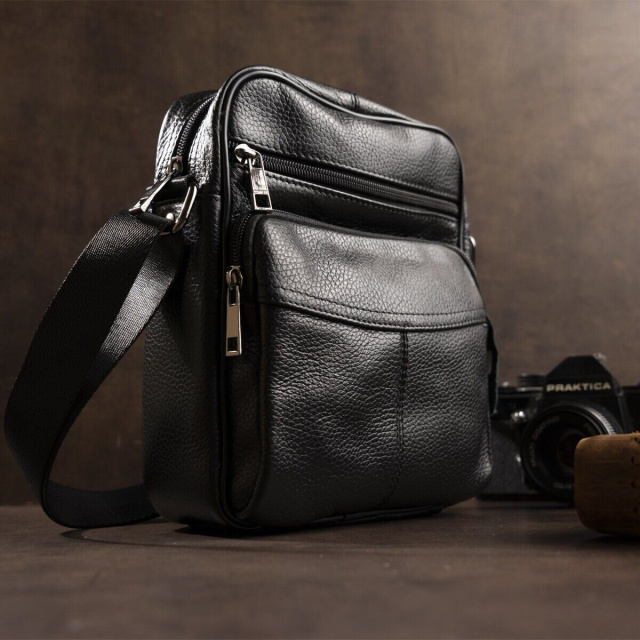 Стильная и одновременно компактная мужская сумка из натуральной кожи. По краям аксессуар прошит темной нитью. Все швы ровные, торчащих ниток нет. Внутри аксессуара платная текстильная подкладка коричневого цвета. Аксессуар дополнен несъемным текстильным регулируемым ремешком. В сумке есть ручка для носки в руках. Очень современная и продуманна модель. Производство фабричный Китай хорошего качества. Подойдет для ежедневного использования. Хороший вариант на работу или в поездку. Будет прекрасным подарком по любому поводу.