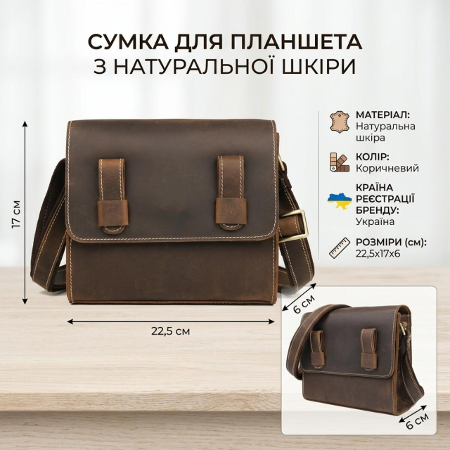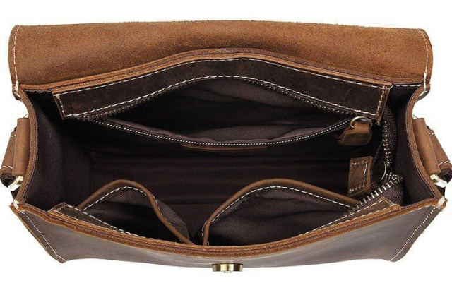 Изделие выполнено из натуральной кожи коричневого цвета. Материал приятный на ощупь, а со временем выглядит еще более эффектно, что подчеркивает характер винтажной кожи. Сумка дополнена качественной фурнитурой и продуманным дизайном, а сам аксессуар упакован в тканевый чехол, поэтому может стать еще и удачным вариантом подарка.