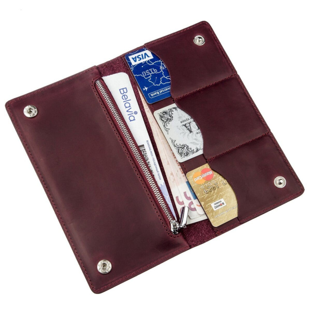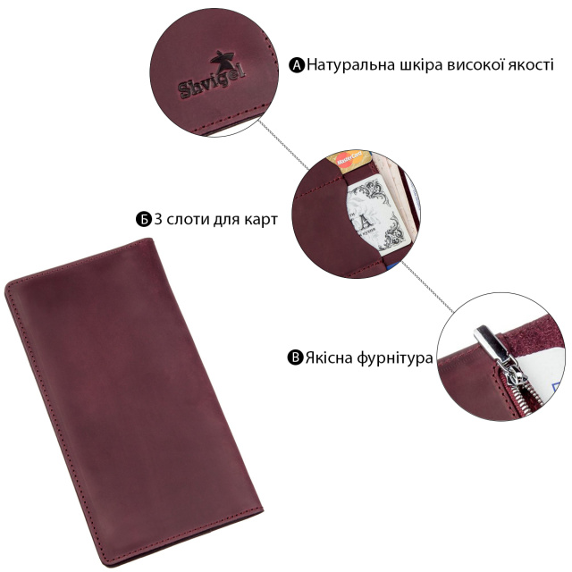 Цвет: бордовый; Материал: натуральная кожа высокого качества; Размеры (ШхВ, см): 19х9,5х1; Страна производитель: Украина. Внутри: - 2 отделения