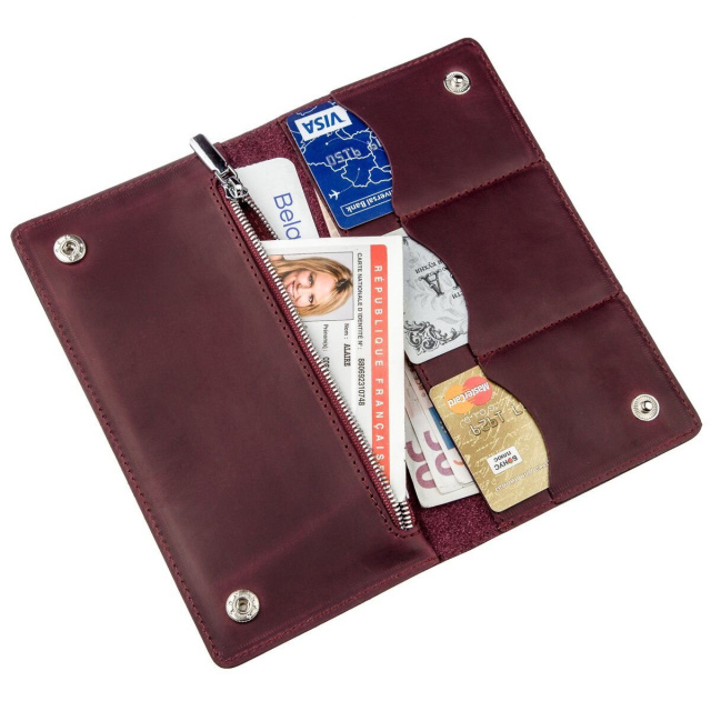 Бордовый женский кошелек из натуральной кожи высочайшего качества. Производство - Украина. В производстве изделия используется только материалы высочайшего качества и проверенные технологии производства. Винтажная кожа пользуется особенной популярностью среди клиентов за свой своеобразный эффект старины. Со временем на аксессуарах из такой кожи появляются мелкие царапины и потертости, что и придает изделию особого шарма. Кошелек легко поместится в женскую сумочку и поможет вам держать деньги в порядке и целостности. Модель доступна в разных цветах и кожах.