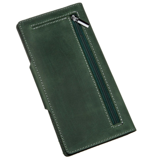 Солидный бумажник из винтажной кожи. Аксессуар выполнен в оригинальном зеленом цвете. Кожа обладает матовостью, мелкими потертостями и царапинами. Кошелек прошит сверхнадежной нитью. На лицевой стороне (в правом нижнем углу) находится тесненный логотип компании-производителя SHVIGEL. Аксессуар закрывается на кнопку (ближнюю или дальнюю) в зависимости от его наполненности. Модель доступна в разной коже и цветах