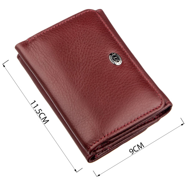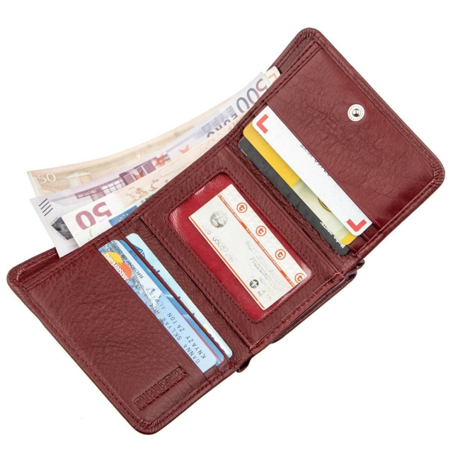 Оригинальный кожаный бумажник для женщин, которые не любит большие и громоздкие кошельки. Это аксессуар имеет не большой размер и с легкостью поместится в дамскую сумочку любых размеров, в том числе и в совсем маленькие женские клатчи или сумку на пояс, что очень популярно в наши дни. Изделие выполнено в притягательном темно-красном цвете с матовой фактурой. Имеет достаточное количество отделений, чтобы выполнять свои основные функции, в нем есть место для купюр, монет или других мелких ценностей и место для карточек и визиток. Закрывается бумажник на удобную и простую кнопку, что позволяет его быстро открывать. Упакован аксессуар в фирменную белую коробку с логотипом производителя.