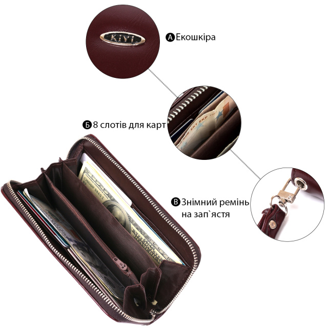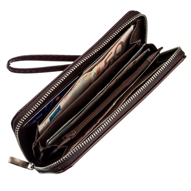 Утонченный женский кошелек из экокожи коричневого цвета. Аксессуар имеет весь самый необходимый функционал: просторные отделения для купюр, ячейки для карточек подобранные под размер, отделение на молнии и открытые карманы. Модель дополнена молнией серебристого цвета и металлическим логотипом бренда на лицевой стороне. Внутри изделие изготовлено из экокожи в сочетании с прочным текстилем. В нашем интернет-магазине вы можете найти подходящую модель по доступной стоимости.