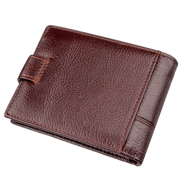 Классический компактный мужской кошелек без лишних деталей. Аксессуар имеет необходимый функционал для любого мужчины. Закрывается кошелек на кожаный хлястик с кнопкой. Материал исполнения – натуральная кожа высочайшего качества. В комплекте идет картонная коробка желтого цвета.