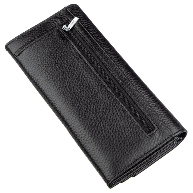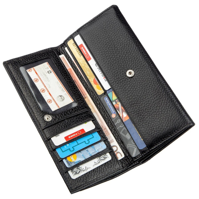 Шикарный женский кошелек-визитница для деловых женщин с отличным чувством стиля и замечательным вкусом. Дизайн изделия очень красивый и современный, поэтому подойдет для женщин любого возраста и положения. Изготовлен кошелек из натуральной высококачественной кожи с высокими эксплуатационными показателями. Цвет изделия – насыщено черный, который является самым универсальным и практичным. Визитница закрывается на металлическую кнопку и насчитывает семь отделений для карт. На внешней стороне расположена вместительная монетница на молнии. Основное отделение имеет достаточно пространства для купюр и прочих ценностей. Упакован кошелек в картонную белую коробку с фирменным логотипом.