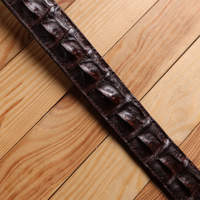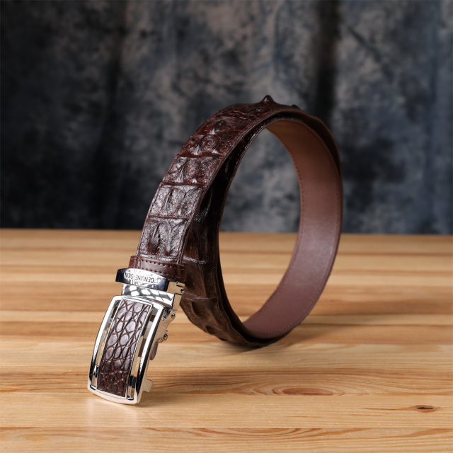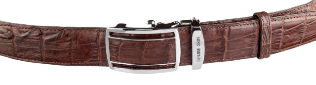Очень красивый ремень из экзотической, натуральной кожи крокодила (каймана). Аксессуар изготовлен на основании из гладкой телячьей кожи и прошит коричневой нитью с обеих сторон. Изделие оборудовано съемной автоматической пряжкой, которая декорированная вставкой, из натуральной кожи крокодила. Изделия из кожи крокодила всегда считались большой роскошью, так как в мире не так уж много компаний, которые занимаются выделкой такой кожи, поскольку этот процесс действительно чрезвычайно трудоемкий. Поскольку рептилия основную часть жизни живет в воде, водоустойчивость у изделий из их кожи наивысшая. Идеальный подарок для людей, которые любят все дорогое и качественное. Каждое полотно имеет уникальный, не повторяющийся узор, поэтому, покупая ремень из кожи крокодила, вы можете быть полностью уверенны в том, что второго такого ремня нет в природе.