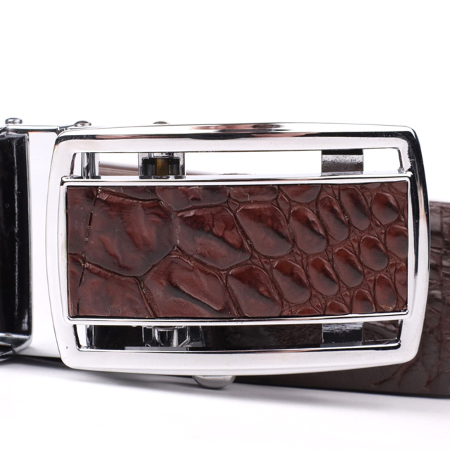 Оригинальный ремень из экзотической, натуральной кожи крокодила. Аксессуар изготовлен на основании из гладкой телячьей кожи. Изделие оборудовано съемной автоматической пряжкой, которая декорированная вставкой, из натуральной кожи крокодила. Изделия из кожи крокодила всегда считались большой роскошью, так как в мире не так уж много компаний, которые занимаются выделкой такой кожи, поскольку этот процесс действительно чрезвычайно трудоемкий. Идеальный подарок для людей, которые любят все дорогое и качественное. Ремень универсальный, его можно носить как под джинсы, так и под брюки. Каждое полотно имеет уникальный, не повторяющийся узор, поэтому, покупая ремень из кожи крокодила, вы можете быть полностью уверенны в том, что второго такого ремня нет в природе.