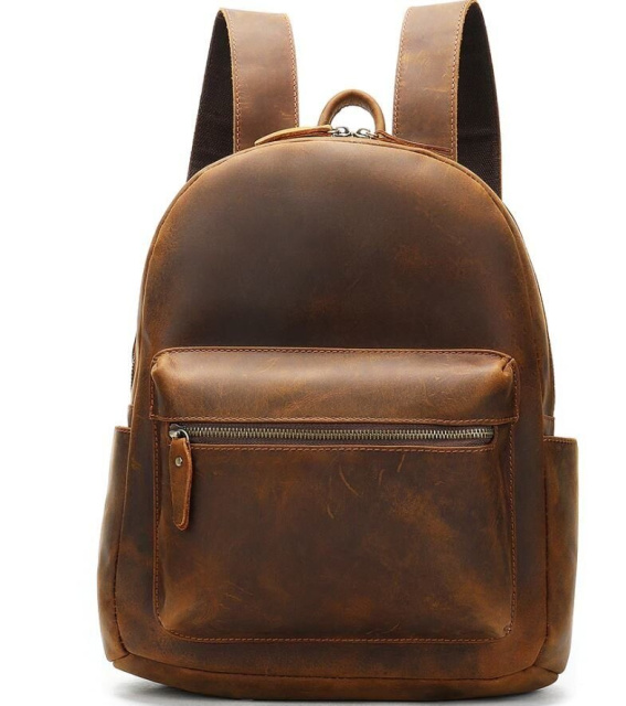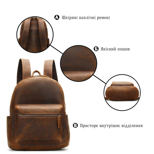 Вместительный рюкзак для ноутбука. Хороший вариант, чтоб носить с собой ноутбук на работу или в путешествие. Сумка с эффектом старины выглядит очень стильно и по богатому. В рюкзаке вы можете носить также документы или вещи. Модель прошита рыжей нитью и дополнена фурнитурой золотистого цвета.